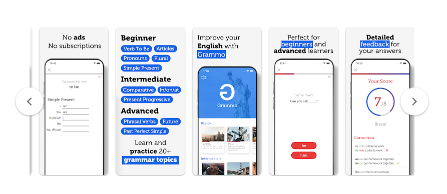 يُعد تطبيق Grammo منصة تعليمية متخصصة في تعليم قواعد اللغة الإنجليزية، حيث يقدم مجموعة واسعة من الدروس والتمارين المصممة بعناية لمساعدة المتعلمين على فهم القواعد اللغوية وإتقانها.