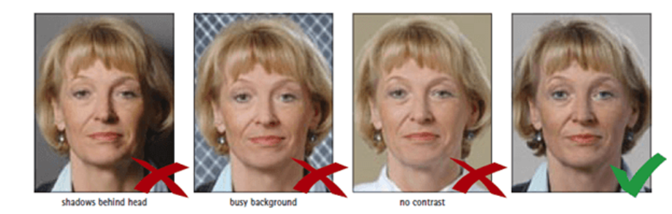 ويشترط أيضاً أن تكون خلفية الصورة أو ما يقع خلف الشخص في الصورة ذو لون موحد خالٍ من الزخارف والنقوش ، وبدون أية ظلال،