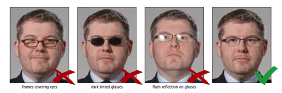 في حال كان المتصور يرتدي نظارات فيجب أن تكون ذات عدسات لا تخفي عينية ولا تغطي وجهه ، بالإضافة إلى أنها يجب ألا تعكس الإضاءة ، كما هو واضح في المثال .