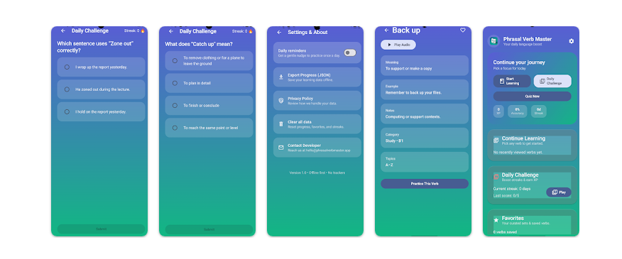 وقد صُمّم تطبيق Phrasal Verb Master لمساعدة متعلمي اللغة الإنجليزية على فهم الأفعال المركبة واستخدامها بصورة طبيعية وسلسة، بعيداً عن الحفظ الجاف أو الشرح المعقّد. ويقدّم التطبيق معاني واضحة مدعومة بأمثلة مأخوذة من الحياة اليومية لتكون أكثر قرباً من الواقع، إلى جانب اختبارات قصيرة تسهم في تثبيت المعلومات بسرعة.